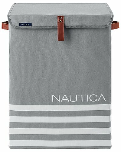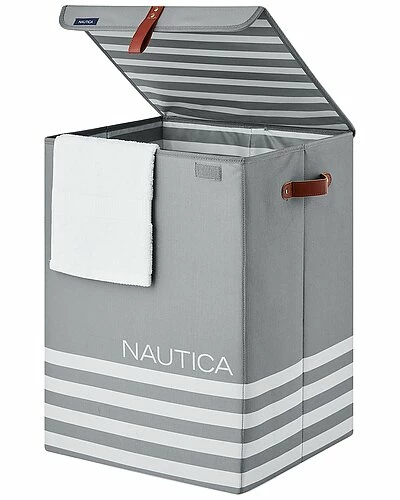 - This Nautica Folded Hamper with Lid in Grey Stripe offers a stylish and easily storable solution for all your laundry organization needs This multi-functional piece features a lid to keep contents concealed, durable reenforced handles and a convenient collapsible design for easy storage when not in use. The trendy neutral color pallet combined with the functionality of the piece make it the perfect storage solution for any space in your home.
