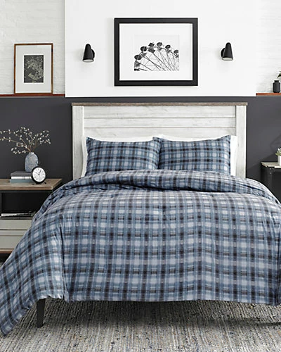 - Design details: Make your bedroom as comfortable to live in as your favorite shirt and jeans with the inviting Pinecrest collection from Nautica Jeans Company. The denim blue and charcoal color palette sets a relaxed casual mood, printed on a sturdy cotton twill that is garment washed for superior softness and extra comfort. Washed chambray blue European shams and decorative pillow are channel quilted with a pick stitch detail, enhancing the casual appeal. An additional channel stitched pillow in charcoal chambray brings out the accent color in the plaid and adds a stylish contrast. Coordinate with our sailing salt grey cotton sheeting to complete the look and layer in our baird blanket in grey for additional warmth and textural interest. Set is machine washable for easy care. Twin/twin XL comforter set includes: one comforter (92″L x 66″W) and one sham (21″L x 27″W). Full/Queen comforter set includes: one comforter (96″L x 86″W) and two shams (21″L x 27″W). King comforter set includes: one comforter (96″L x 104″W) and two shams (21″L x 37″W).