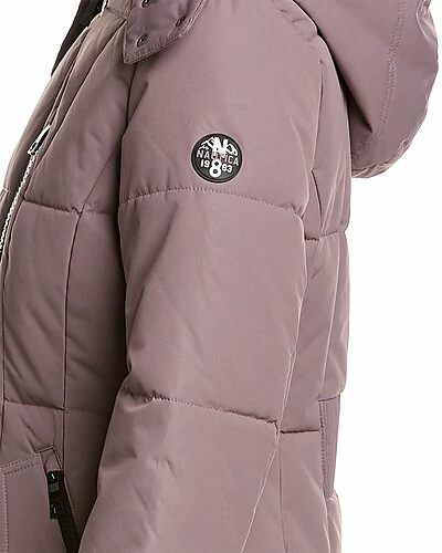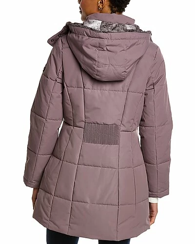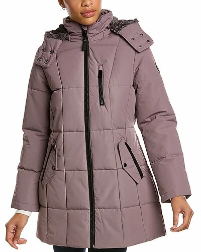 - Design details: quilted design, mock neck, removable hood, faux fur trim, zip left chest pocket, and dual front zip pockets