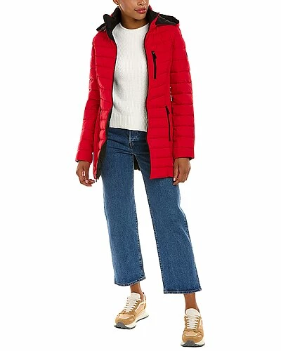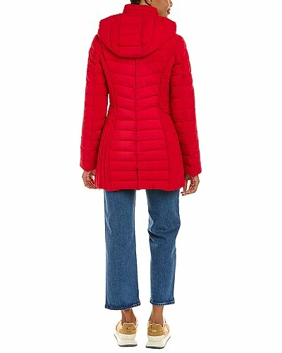 - Design details: puffer style, attached hood, and dual front zipper pockets