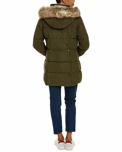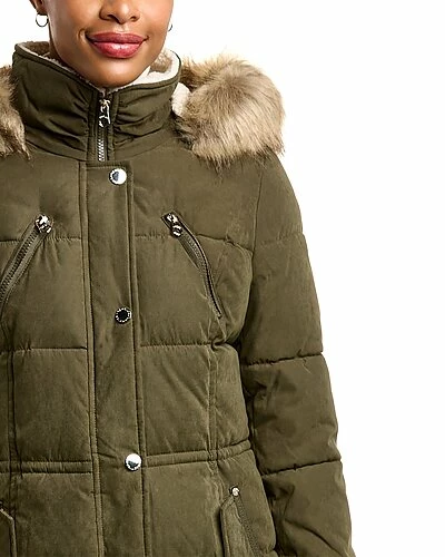 - Design details: stand-up collar, removable hood, faux fur trim, dual zippered chest pockets, dual front pockets, and inner elasticized drawcord waist