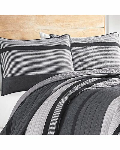 - Design details: dark neutrals sweep across this nautica vessey quilt with piecing of grey and white pinstripes, light grey texture, charcoal herringbone, and bold black ribbing. reversing to a one piece solid grey. mitered corner bindings are sewn with charcoal herringbone for a clean look. woven yarn dyed for a durable and long lasting construction. a 2 inch horizontal channel stitch enhances loftiness of the quilt and ensures filling to not shift in between washes. with the 100% cotton fill, this quilt is easy to maintain plus machine washable. prewashed for an added softness. this 100% cotton quilt (sold separately from the matching shams) is both lightweight and constructed to keep you cozy year round.